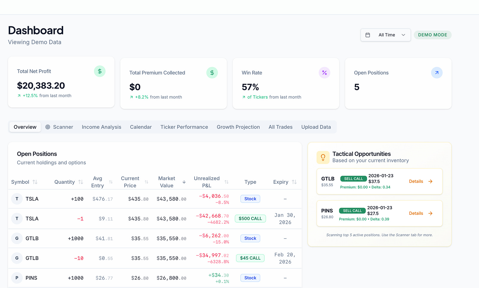 Dashboard: I can see my total net profit, win rate, and premium collected at a glance.