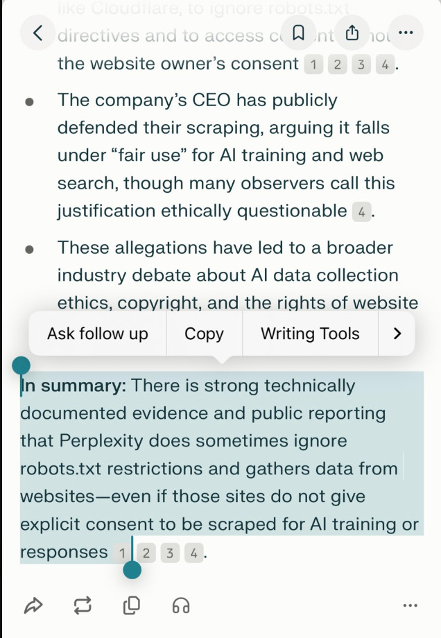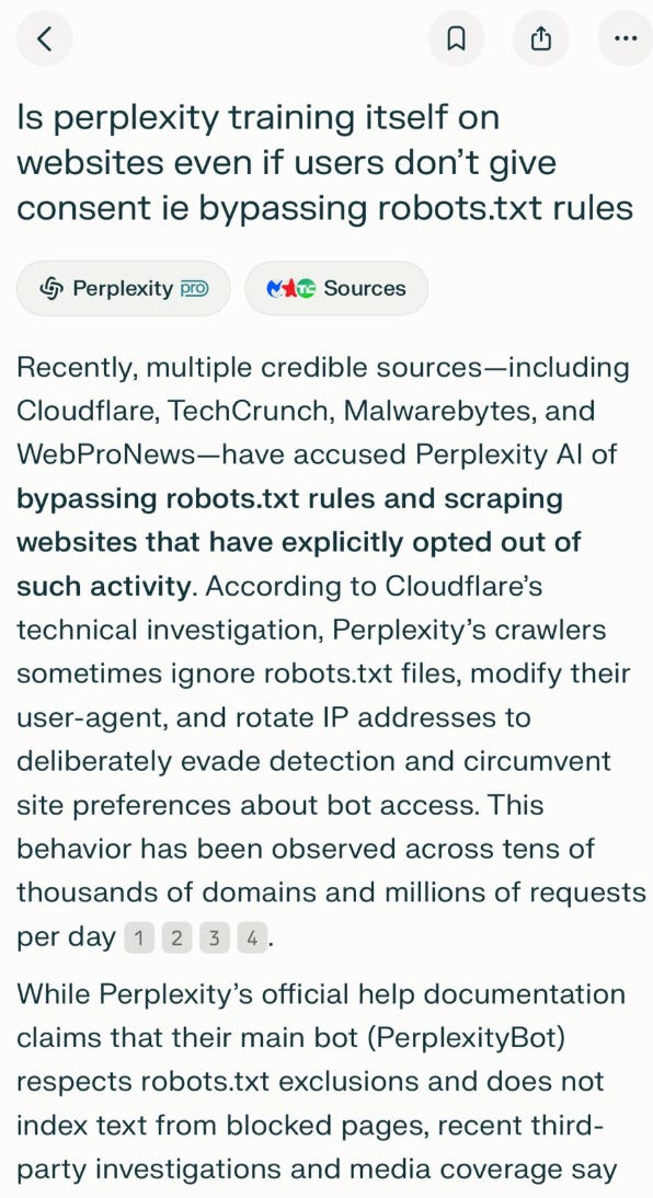Meanwhile, multiple sources, including Cloudflare and Techcrunch, have accused Perplexity of bypassing robots.txt rules. I asked Perplexity to say it ain’t true, and the AI agent’s answer doesn’t exactly fill me with confidence.