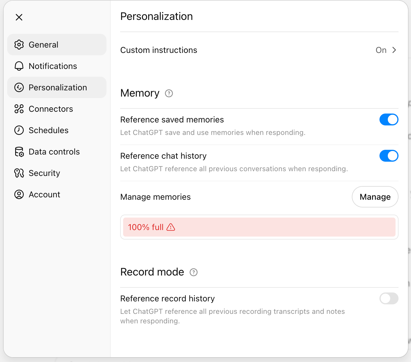 Next, click Manage memories. Now, review all of the memories inside of ChatGPT and delete ones that are out of date.